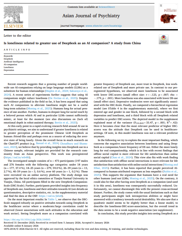 Can AI reduce the loneliness epidemic? New work out in Trends in Cognitive Sciences by Prof. Christian Montag